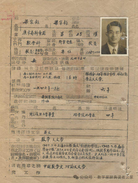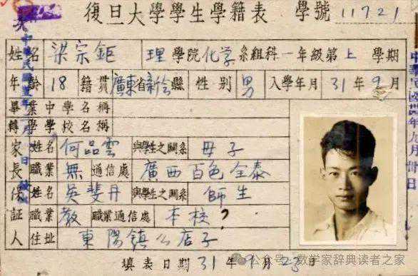 *1942年(民国三十一年)梁宗巨在复旦大学读书时期的学籍表