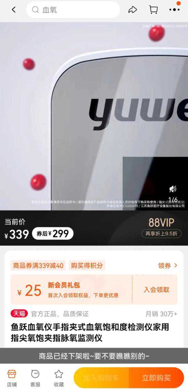 “去年官网88购物节实际94元到手,最近涨到299元”,有网友日前爆料鱼跃同款血氧仪的涨价情况。同时有报道称,“雀芝堂大药房旗舰店”销售的“鱼跃血氧仪YX301指夹式血氧饱和度检测家用手指脉搏心态监测血氧(当天速发)YX301新款”,标价为1380元。而在鱼跃医疗官方店中,型号为YX301的血氧仪标价为299元。