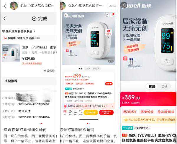 有网友在小红书上反映,8月17日,他购买的鱼跃YX306指夹式血氧仪是139元,到12月22日爆涨到了299元。而到12月23日,该产品已经卖到了359元。
