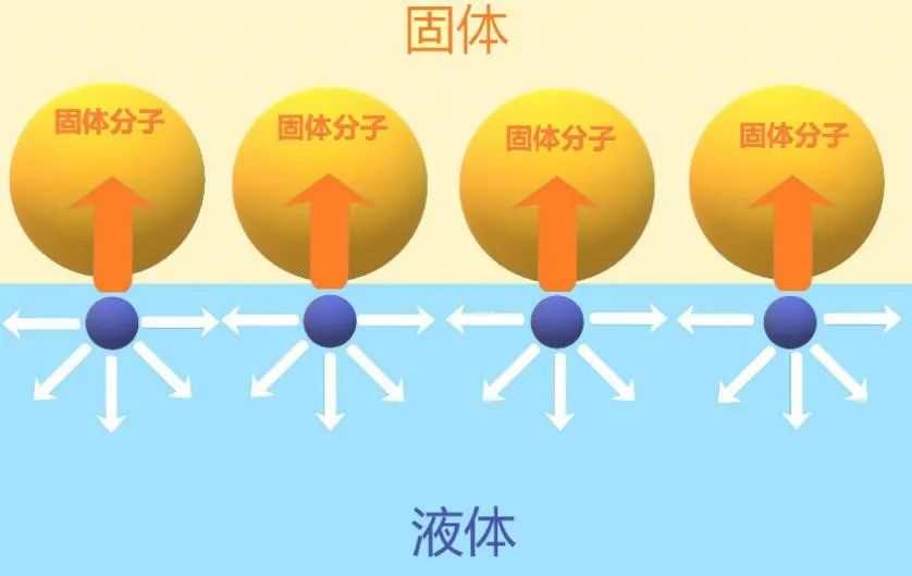 而另一侧是无数个构成固体的分子,这些分子也会与界面处的液体分子发生相互作用,试图把界面处的液体分子拉向自己,这些拉力的总和被我们称为附着力。