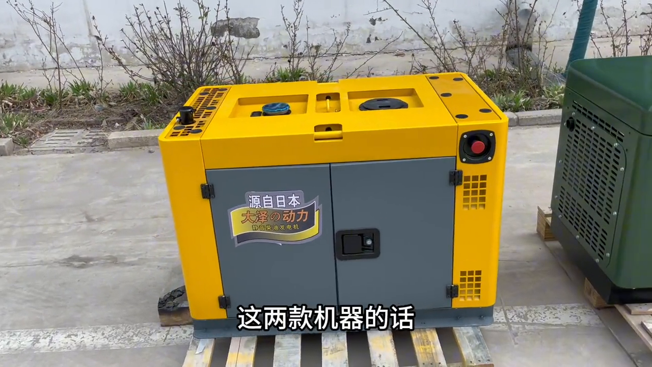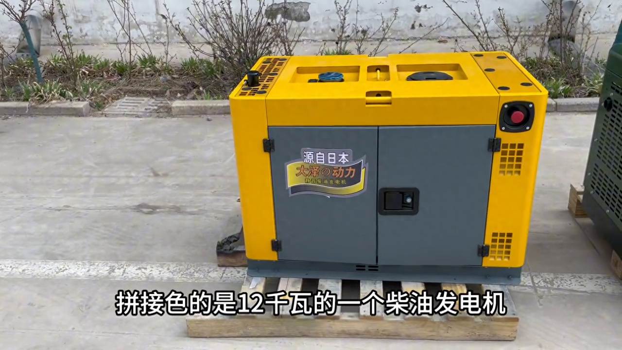 哈喽大家好,这里是大泽动力工厂。现在看到的是这两款柴油发电机组,军绿色的是10千瓦的功率,这一边灰黄拼接色的是12千瓦的柴油发电机。但是从视觉上来看,是不是灰黄的尺寸要小一些,这一款要大一点。