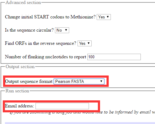 getORF与ORFFinder最大的不同就是可以上传fasta格式存储的序列(不知道什么是fasta格式的同学请自行百度),这样就可以一次上传很多条转录本序列,批量进行处理。其它的设置与ORFFinder相同,可以设置ORF长度最大和最小的限制,也可以选择是否以ATG开头(TranslationofregionsbetweenSTARTandSTOPcodons),默认是不以ATG开头(TranslationofregionsbetweenSTOPcodons)。
