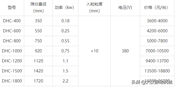 如上表所述,超声波振动筛型号有DHC400mm、DHC600mm、DHC800mm、DHC1000mm、DHC1200mm、DHC1500mm、DHC1800mm。型号越大,单位时间内的处理量就越大,价格也会越贵。