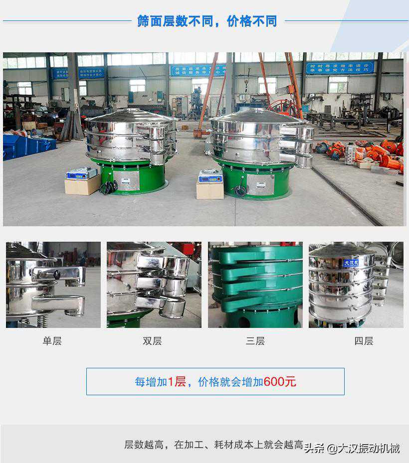 选用不同型号(400mm-2000mm)、材质(碳钢/不锈钢)、层数(1-5层)的超声波振动筛,价格不同。以下是详细介绍: