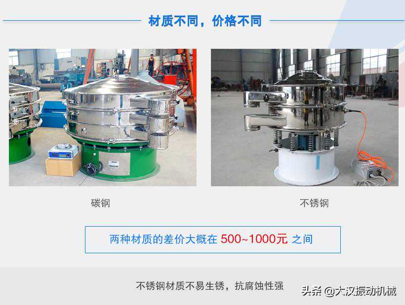 超声波振动筛由碳钢和不锈钢制成。不锈钢不易生锈,抗腐蚀性能强,所以碳钢制作的超声波振动筛比不锈钢制作的超声波振动筛要贵一些,按照市场的定价标准,这两种材料的价格差异在500~1000元左右。