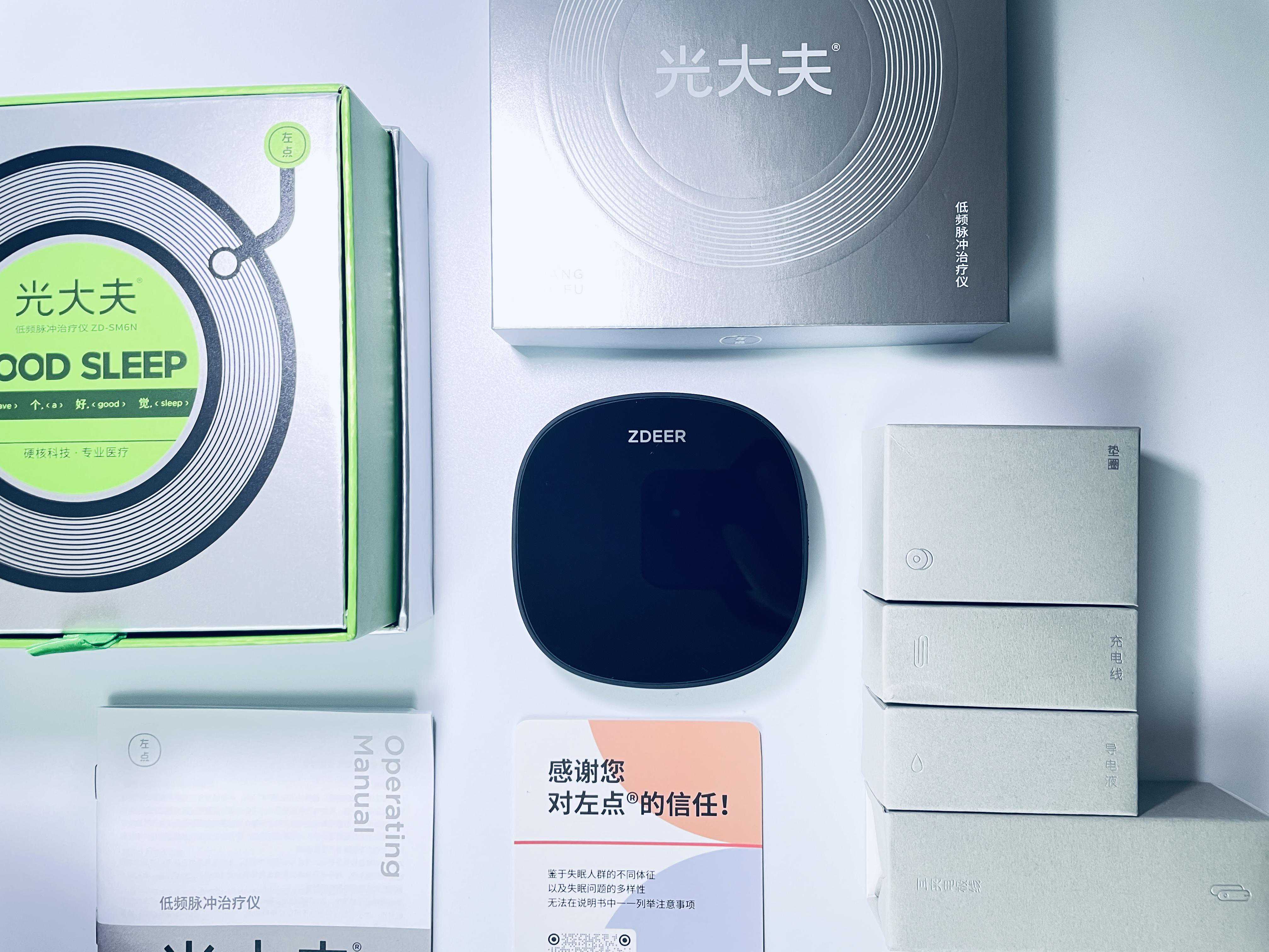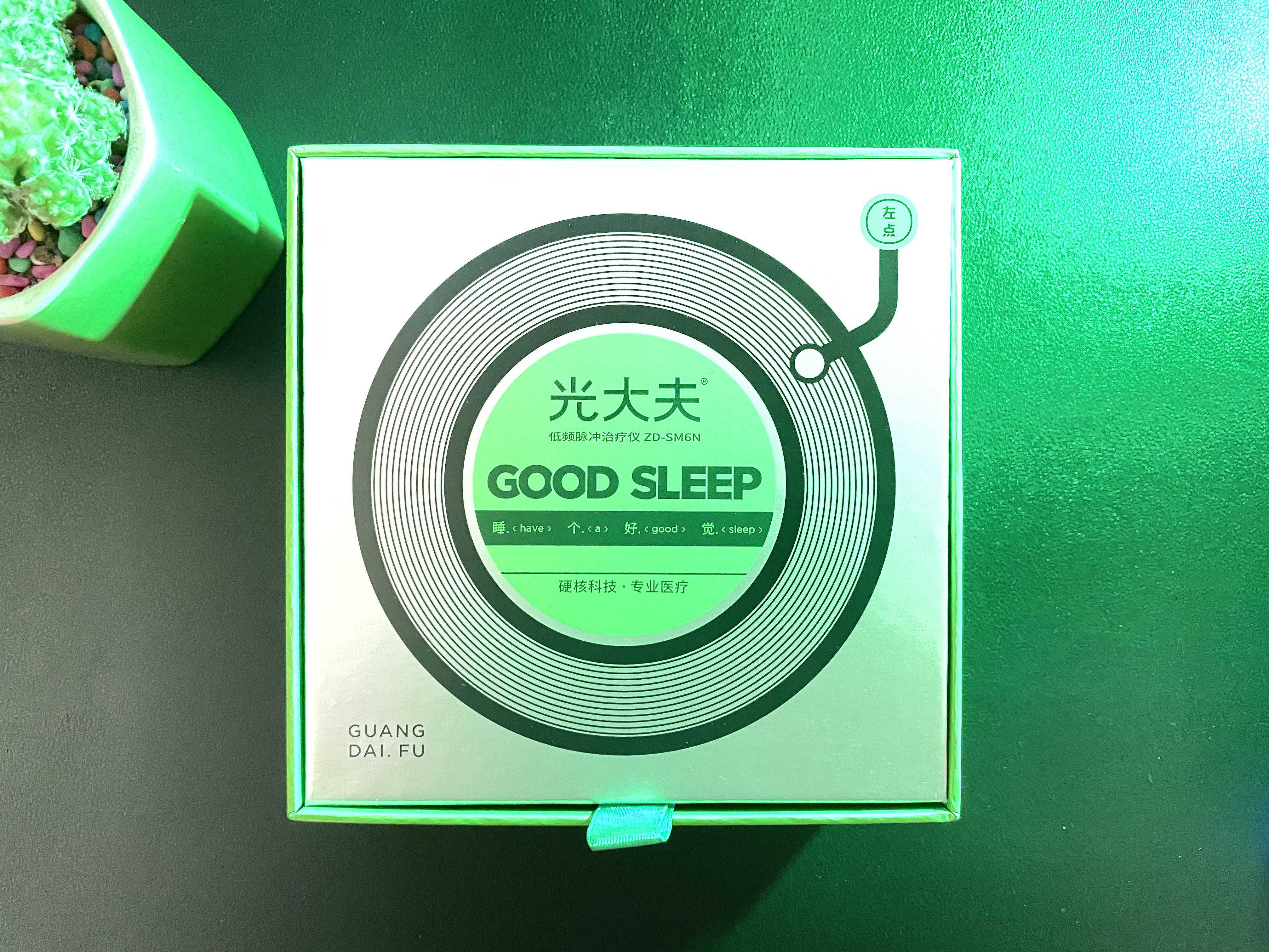 使用及体验篇左点这款光大夫低频脉冲治疗仪采用的是天地盖的设计,银色和绿色的撞色设计很有视觉冲击力。打开盒子,里面有一张小卡片,它还支持睡眠顾问服务,很是贴心。而这款睡眠仪本体采用的是一个黑盒子的形状设计,上面贴有快速操作指南,使用方法一目了然。