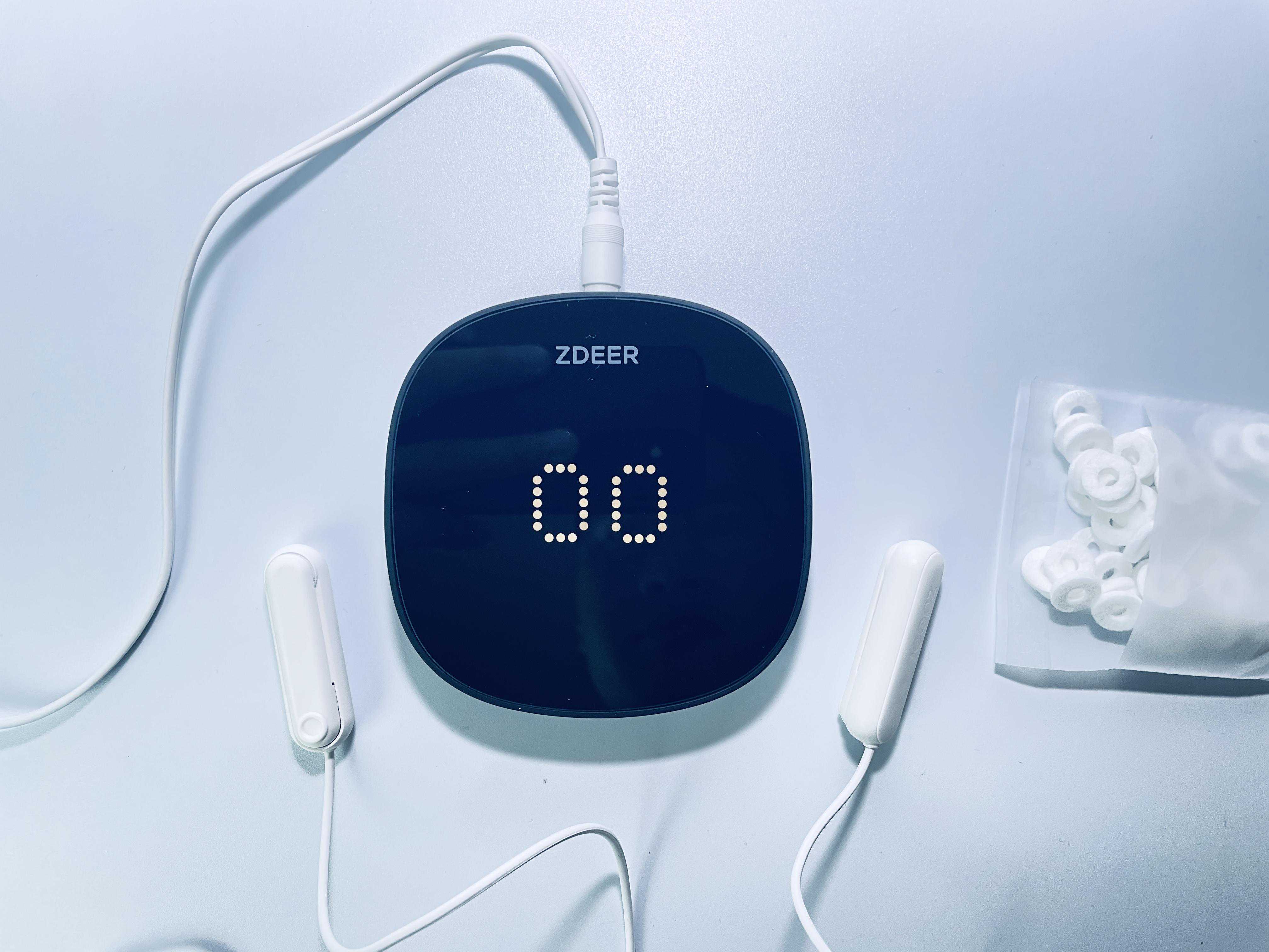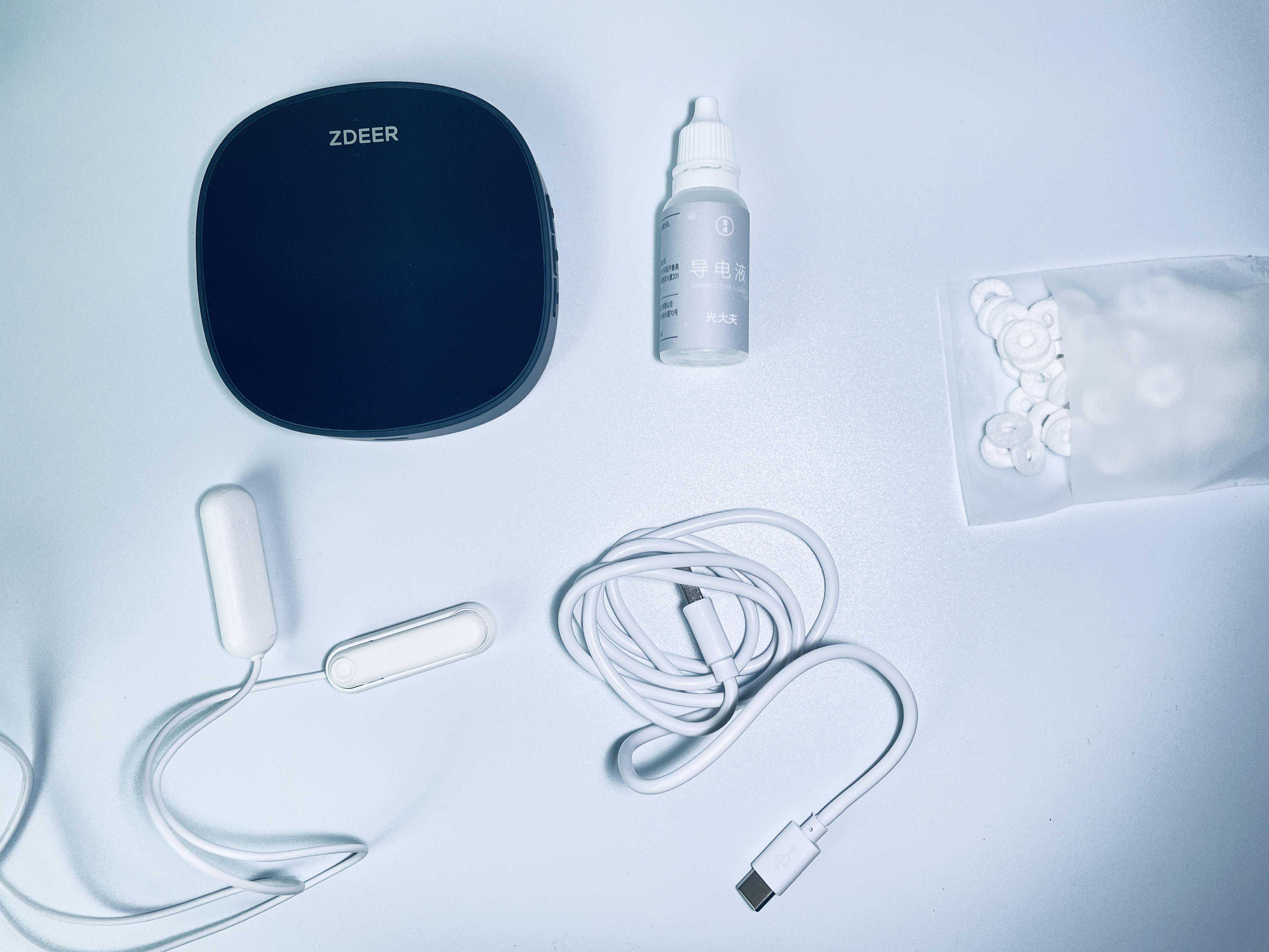 黑盒子上方印有ZDEER即左点的logo,上面是耳夹电极线的接口,下面是支持Type-C的充电接口,右侧有开关机键和强度调节加减键。