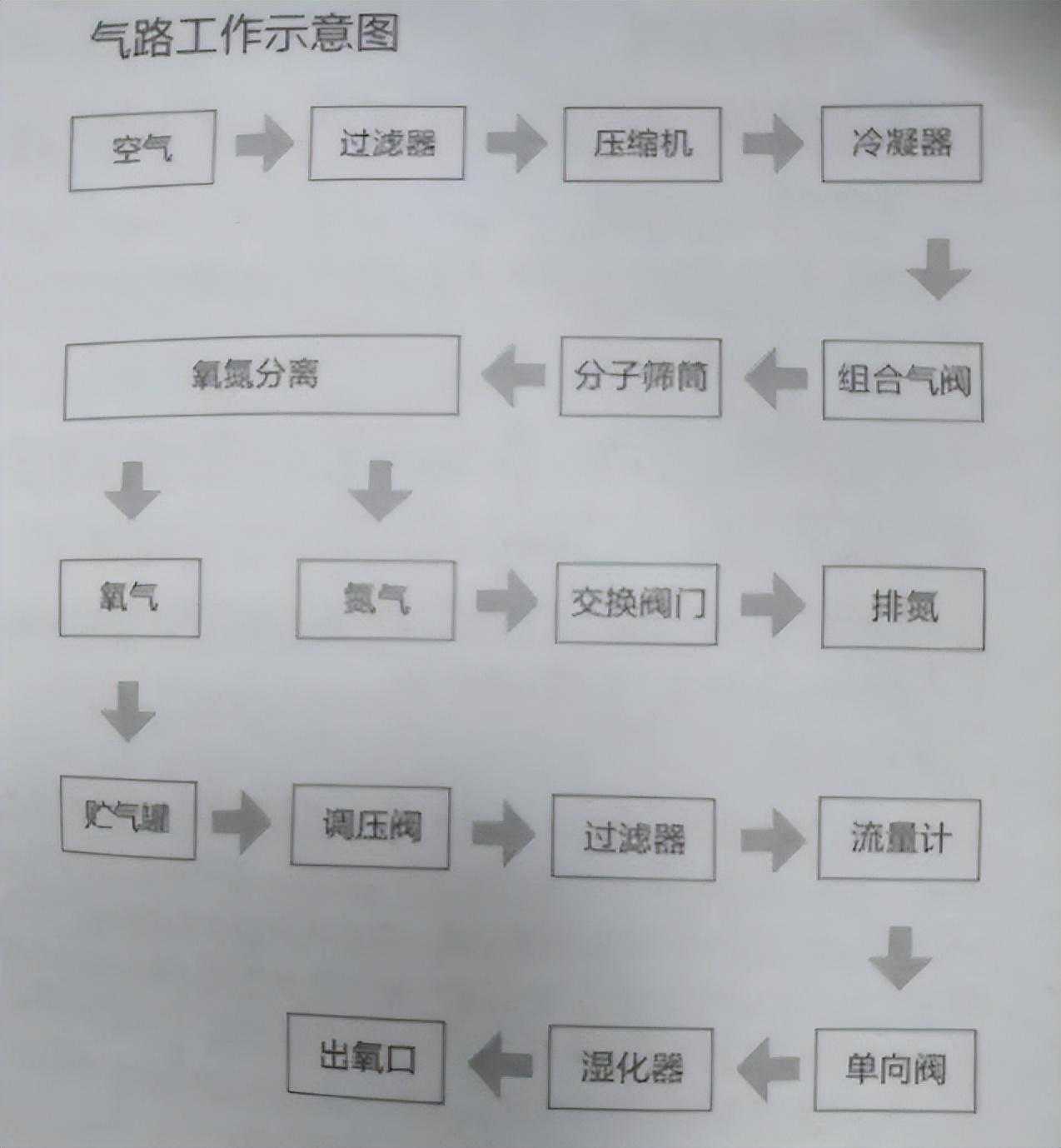 分子筛原理即分子直径小于分子筛微孔的分子被吸附,分子直径大于微孔的分子不被吸附,通过此方式来实现混合气体的净化、分离。其基本工作原理是通过变压吸附(PSA)原理,以空气作为原材料,接通电源后吸附空气中的氮气及其他气体,从空气中分离出纯度较高的氧气(93%±3%)。