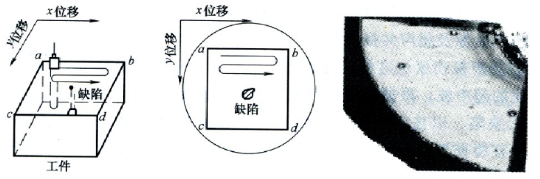 C型显示超声探伤仪当探头在被检测对象表面移动时,荧光屏上显示的是被检测对象内部缺陷的平面投影图,而不能显示缺陷的深度。若以各点的亮度代表回波传播时间,又可得到缺陷深度分析。