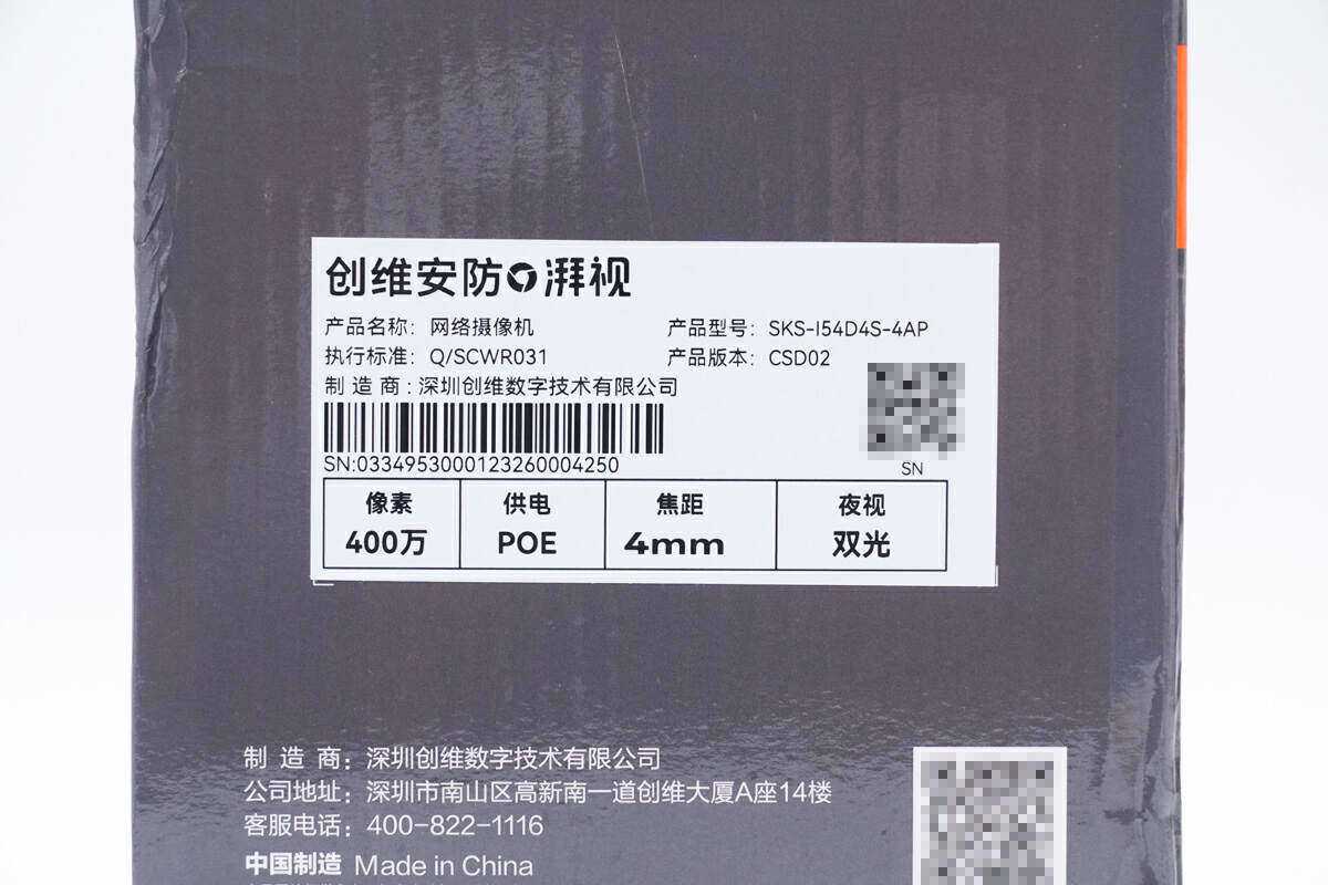 创维智能双光全彩网络摄像机型号为SKS-I54DS-4AP,版本为CSD02,采用POE供电器供电,焦距为4mm,支持400万像素、智能双光以及夜视模式,制造商为深圳创维数字技术有限公司。