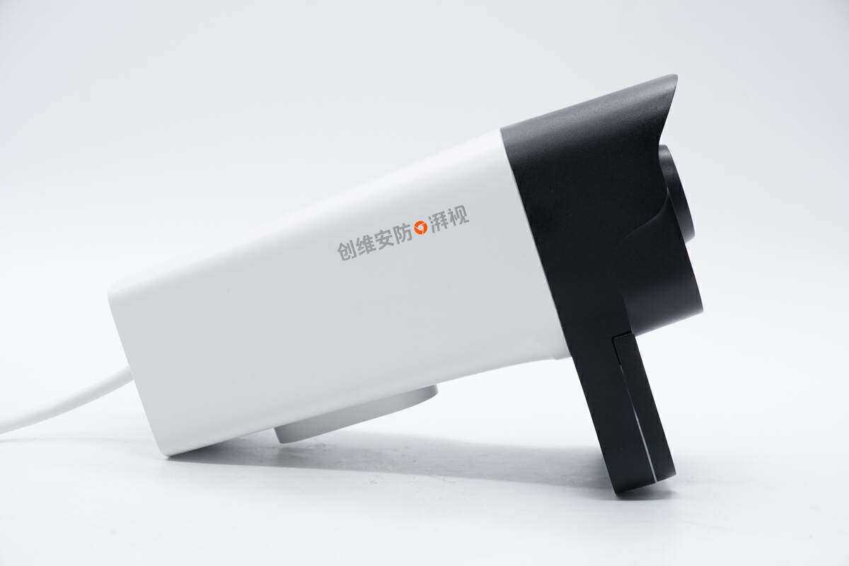 网络摄像机机身设计风格简洁,一侧印有创维安防和湃视。