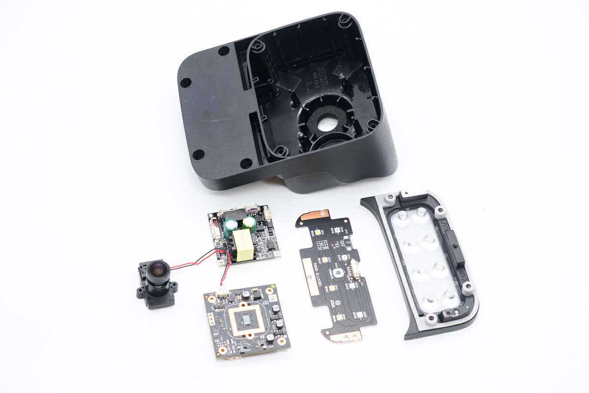 拆解取出摄像机内部传感器模块,供电模块和补光灯模块。镜头外壳内部设有泡棉密封防尘。