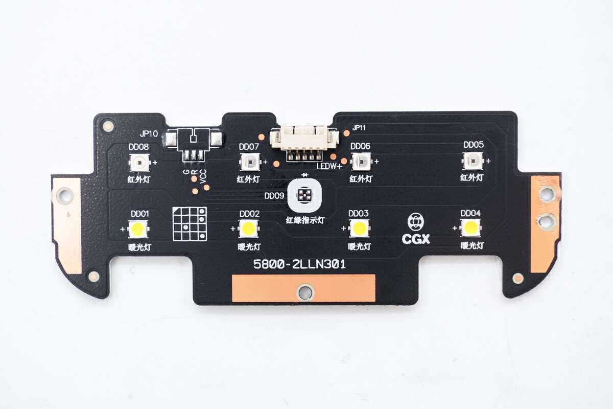 LED灯板正面一览,上方焊接四颗红外线补光灯,下方焊接四颗白色LED补光灯。