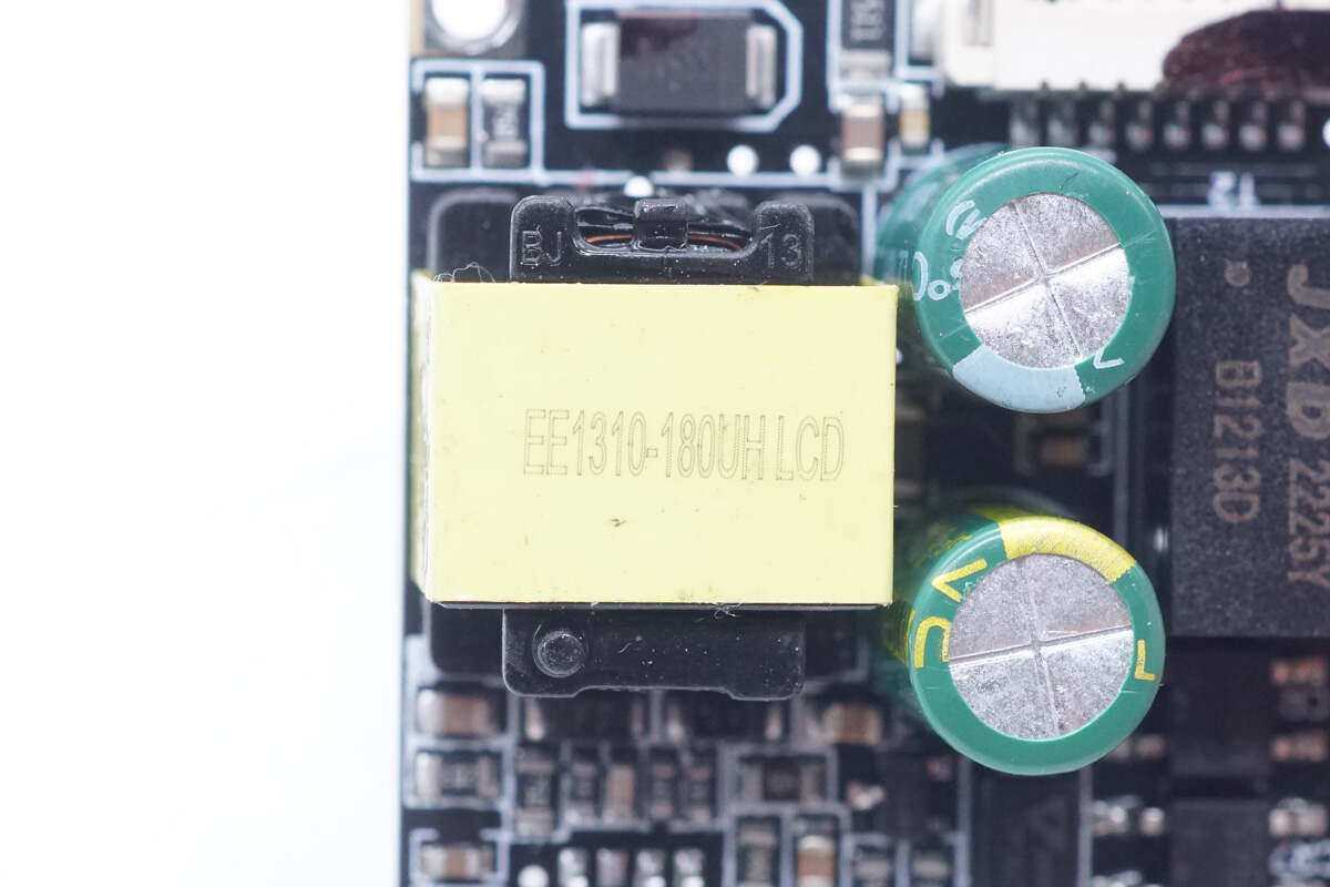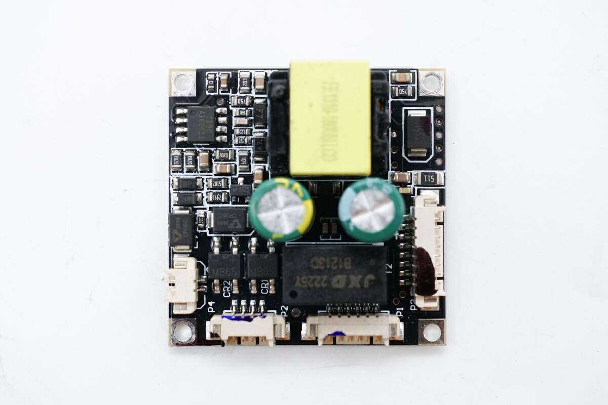 PCBA模块背面没有焊接元件,变压器和电解电容为过孔焊接固定,对应连接器标注有接口定义。