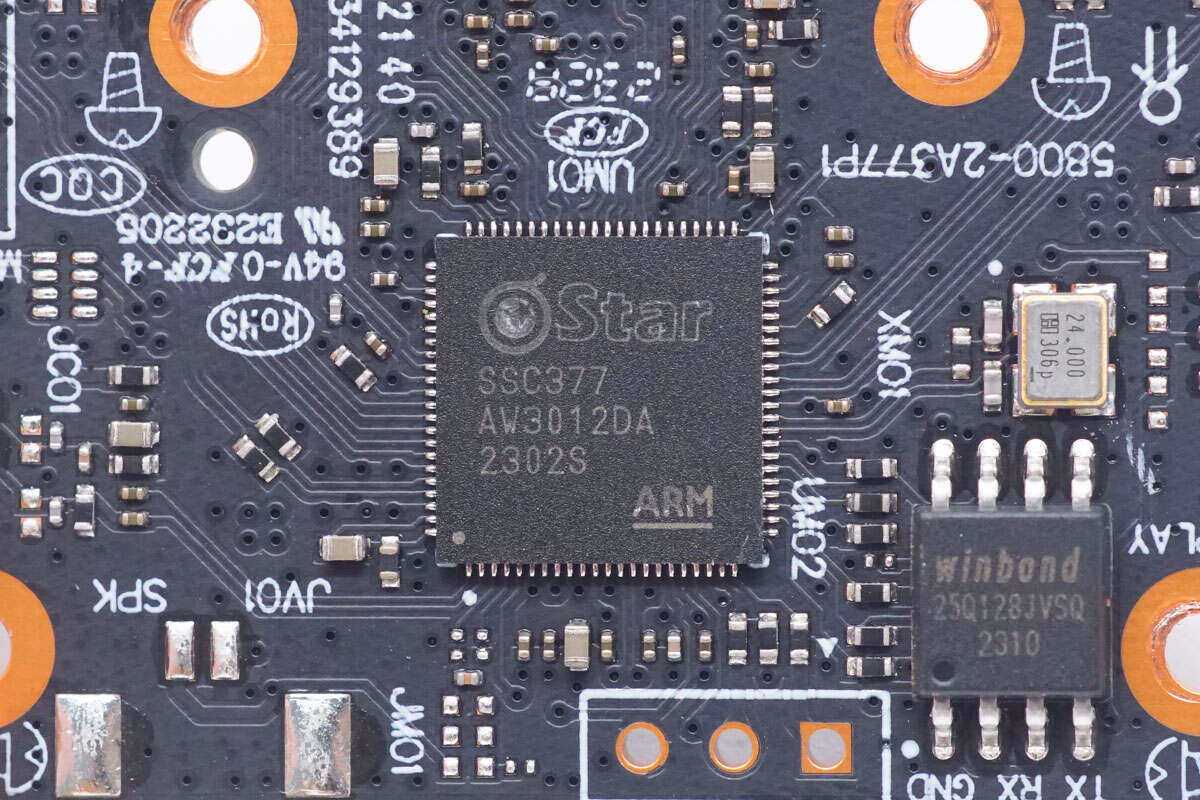 摄像头主控芯片来自星宸科技,型号SSC377,芯片内部集成处理器和DRAM以及网络接口。