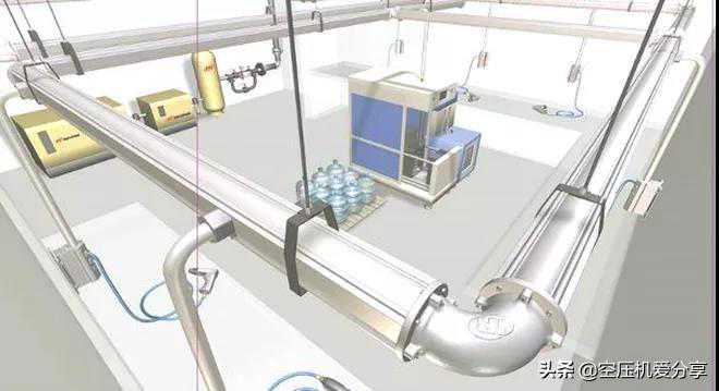 空压机排气到达末端前需经过冷却器、干燥机、过滤器、控制阀以及传输管道等,在传输过程中由于管道的管径、管头和管长等设计不合理会使排气压力受损,排气压力每损耗1bar,对应的电能将多损耗7.5%,因此对管网进行优化可以进一步减少空压站系统耗能。
