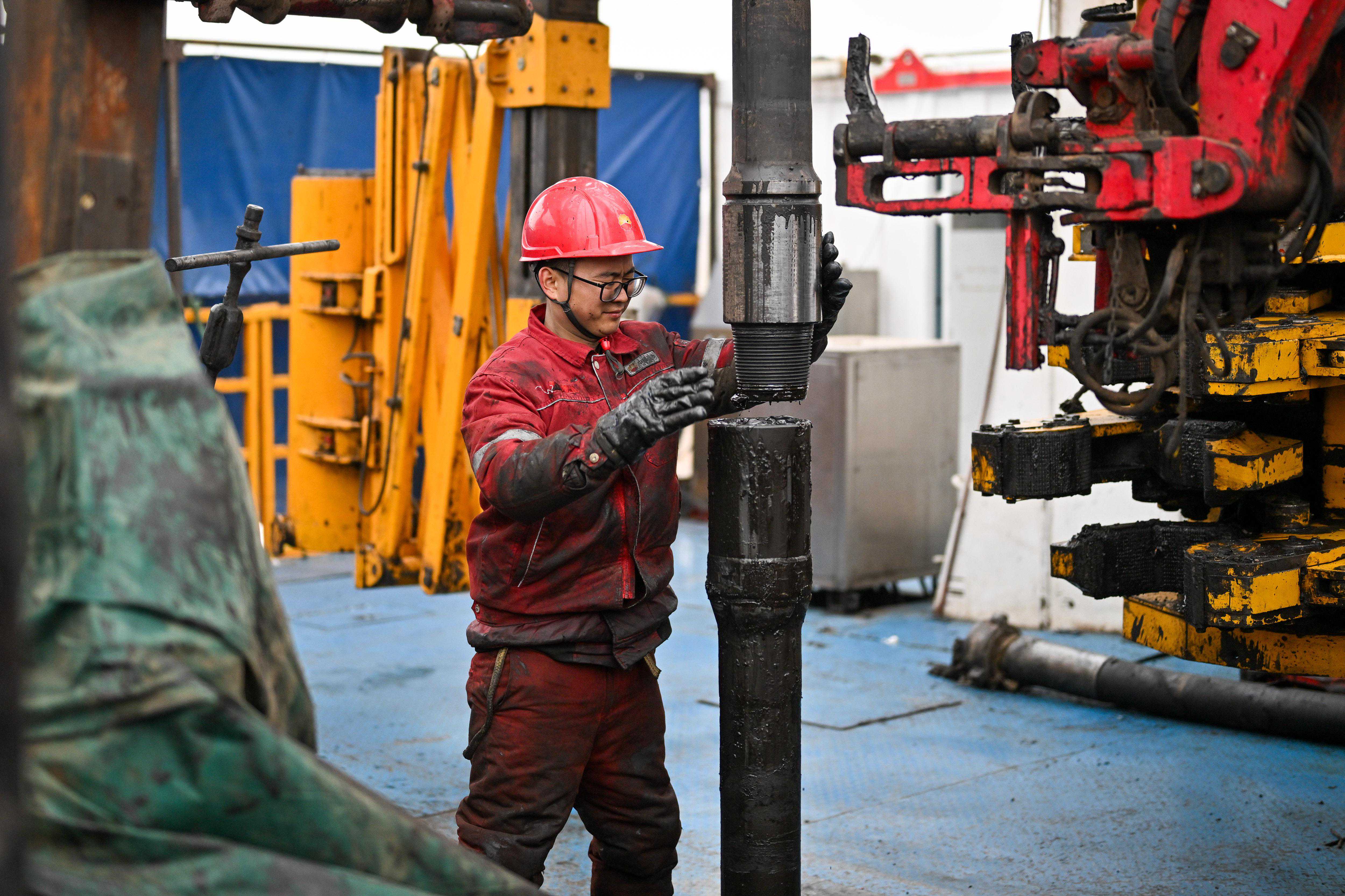3月27日,1205钻井队内钳工李炎(左)辅助外钳工孙诗龙进行接立柱作业。新华社记者陈益宸摄