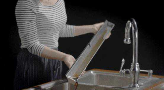 第三步:建议把油杯放进烟机前,可以先在里面放点水和清洁剂的混合溶液,下一次清洗会更轻松。