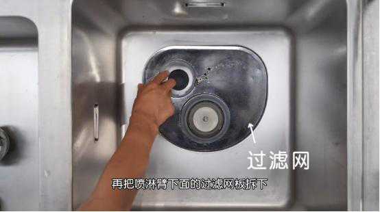 过滤网板在喷淋臂的正下方,直接取下后可使用适量中性洗涤剂并用清水冲洗干净。