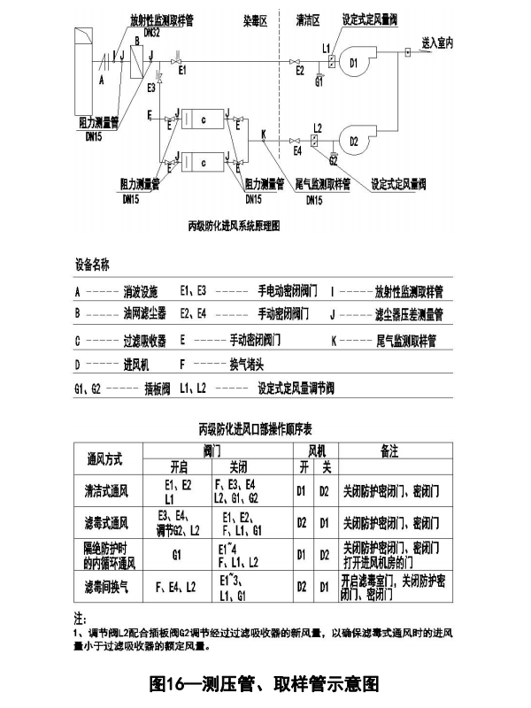 (4)设有滤毒通风系统的人防工程,在其进风系统上未设阻力测量管、取样管或设置位置错误。在滤尘器、过滤吸收器进出风口处均应设置阻力测量管,并且在连接管路上设置测量气体浓度的取样管,通过滤尘器和过滤吸收器阻力变化,及时掌握滤尘和滤毒能力(图16)。清洁式通风管路上,应在其两道密闭阀门之间的滤毒室设置取样管,滤毒式通风管路上,应在其两道密闭阀门之间过滤吸收器前后各设置一根阻力测量管,在滤毒室内进入风机的总风管上设置尾气监测取样管,阻力测量管和取样管应和风管同时制作。有的施工图无此要求,或者阻力测量管、取样管遗漏、设置位置不正确。