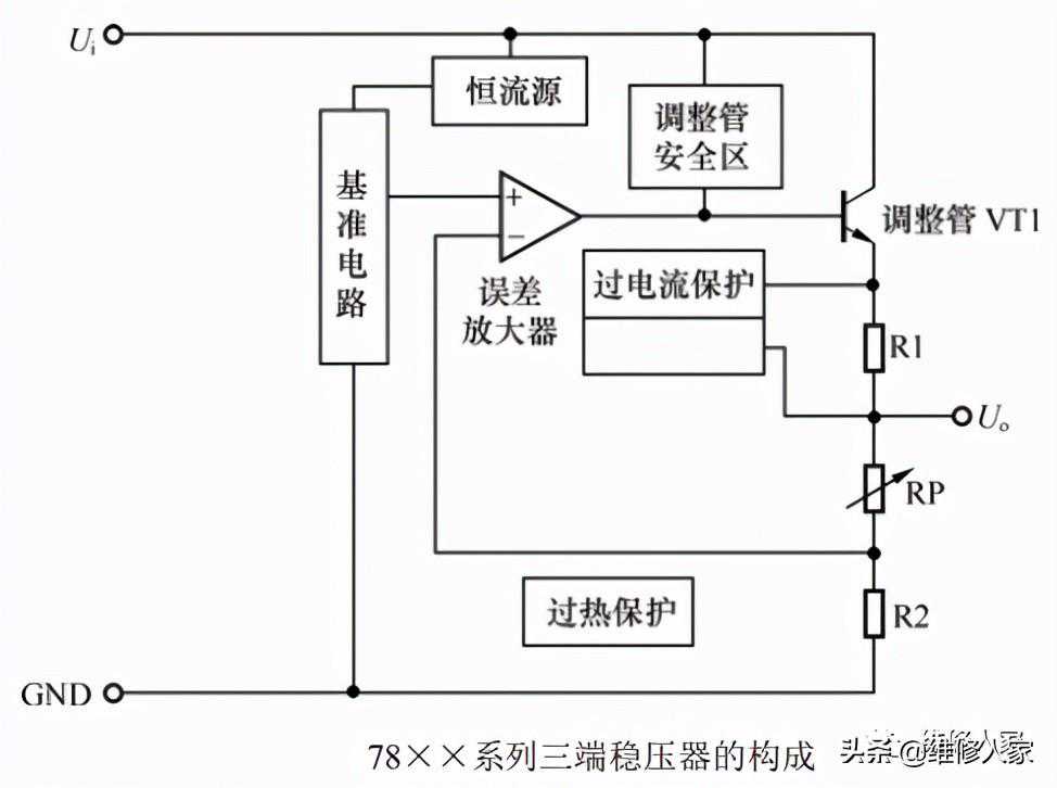 如上图所示,当78××系列三端稳压器输入端有正常的供电电压Ui输入后,该电压不仅加到调整管VT1的c极,而且通过恒流源为基准电路供电,由基准电路产生基准电压。基准电压加到误差放大器后,误差放大器为VT1的b极提供基准电压,使VT1的e极输出电压。该电压经R1限流,再通过三端稳压器的输出端子输出后,为负载供电。当输入电压升高或负载变轻,引起三端稳压器输出电压Uo升高时,通过取样电阻RP、R2取样后的电压升高。该电压加到误差放大器后,使误差放大器为调整管VT1提供的电压减小,VT1因b极输入电压减小导通程度减弱,它的e极输出电压减小,最终使Uo下降到规定值。当输出电压Uo下降时,稳压控制过程相反。这样,通过该电路的控制确保稳压器输出的电压Uo不随供电电压Ui高低和负载轻重变化而变化,实现稳压控制。