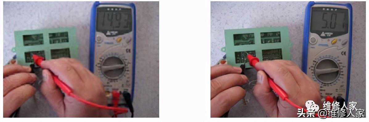 检测三端不可调稳压器时,可采用电阻测量法和电压测量法两种方法。而实际检测中,一般都采用电压测量法。下面以空调通用板的5V电源电路为例进行介绍,测量过程如图所示。