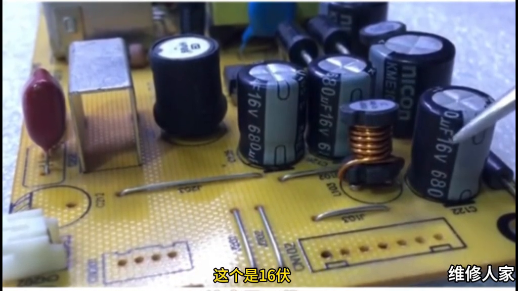 再说一下在维修的过程中如果没有找到合适的一模一样的电容,可以找个别的电容代换。代换的时候先看电容是多少伏的,这个幅数是耐压值,这个是16伏,最高可以耐压16伏的电压。代换的情况下可以找个25伏的,可以比它高的,不能比它低,如果比它低的情况下更容易损坏。