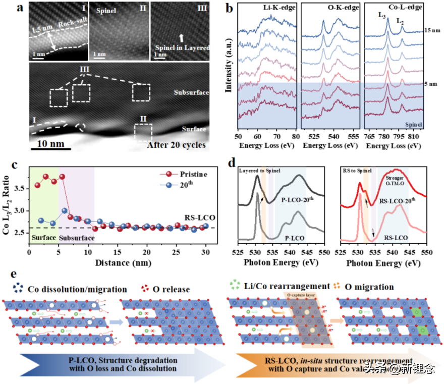 通过循环后的EELS和软X射线吸收光谱(SXAS)结果进一步证实了相演变过程和增强的结构稳定性,由于从盐岩到尖晶石的相变,RS-LCO表面的缺Li态消失;在531.6eV处出现OK边的预峰;CoL3峰位移在表面区消失。图4c比较了RS-LCO样品在原始状态和20次循环后从表面到内部(深度30nm内)的CoL3/L2比率的变化,Co的L3/L2比能更清楚地反映Co价态的变化,可以看出由于相变,表面Co的价态增加。图4d展示了P-LCO和RS-LCO在初始和第20个周期后在Tey模式下SXAS的OK边谱。对于P-LCO,发生了从层状(Co3+)到尖晶石(Con+,2n3)的传统相变过程。具体来说,在原始的P-LCO中,位于530.5ev的峰对应于co3+-o2p杂化状态,在第20个循环后,观察到一个更大角度的肩峰(532.2ev),该峰对应于低co价尖晶石。对于rs-lco,经过20圈的循环,表面从盐岩相(co2+(主要)co3+(次要)混合态,534.7ev)到尖晶石相(con+,2n3,532.2ev)的跃迁是通过从亚表面俘获活性晶格o而发生的。此外,rs-lco在535-545ev范围内的特征峰更宽、更高,这很好地对应了较强的o2p-tm4s4p相互作用,有利于形成更稳定的o骨架。总的来说,rs-lco表面上缺li的盐岩相在充电时,li+离子穿过该层带来额外的li+离子,并从亚表面区域捕获了迁移的o,将co价态从co2+3+增加到co34+,这种从盐岩到尖晶石的相变是一个渐进的过程,经过一定的循环,表面上的所有盐岩相都转变为尖晶石相。这种特殊的反常相变使rs-lco的循环和倍率性能得以增强。