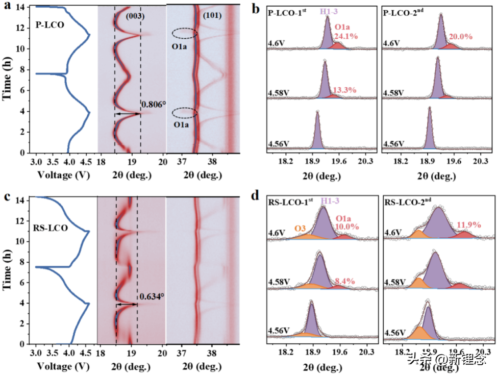 对于体相结构,当充电到4.55V以上时,O3/H1-3相变发生,伴随着晶格体积收缩,内应力和微裂纹的产生,最终导致相结构的坍塌。因此,抑制不可逆O3/H1-3相变是提高LCO循环稳定性的关键,利用原位XRD揭示了原始LCO(P-LCO)和RS-LCO的相演变过程。通常(003)峰的位移(Δ2Θ)代表Co-O层的层间距变化。作为比较,P-LCO和RS-LCO的Δ2Θ值分别为0.806°和0.634°,表明RS-LCO的晶格变化受到抑制。当充电到4.6V时,RS-LCO观察到较少的O1a相(H1-3内部分离的O1相),而对于P-LCO,O1a相的产生明显出现,表明P-LCO中更多的H1-3分离。当充电电压超过4.56V时,(003)峰可以分成位于18.6°、19.0°和19.6°处的O3、H1-3和O1a相。对于P-LCO,一旦充电超过4.56V,O3相完全消失,而对于RS-LCO,O3相一直保持到4.6V,表明表面RS层可以延迟从“O3到H1-3,再到O1a”的相变,从而使RS-LCO具有较高的体相结构稳定性。此外在充电到4.6V后,RS-LCO的半峰宽明显大于P-LCO,表明RS-LCO的H1-3相具有短程有序特征,放电时这种短程有序的H1-3相更倾向于回到O3相,从而使RS-LCO具有高的相变可逆性。由于对O3/H1-3相变的延迟效应和H1-3相分离的抑制,RS-LCO中O1a相的比例明显低于P-LCO。RS-LCO体相结构呈现出相对完整的层状结构,有效地防止了后续循环中体相裂纹的形成。