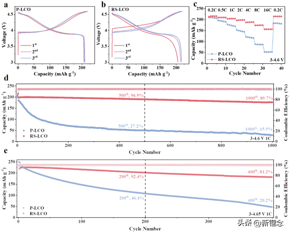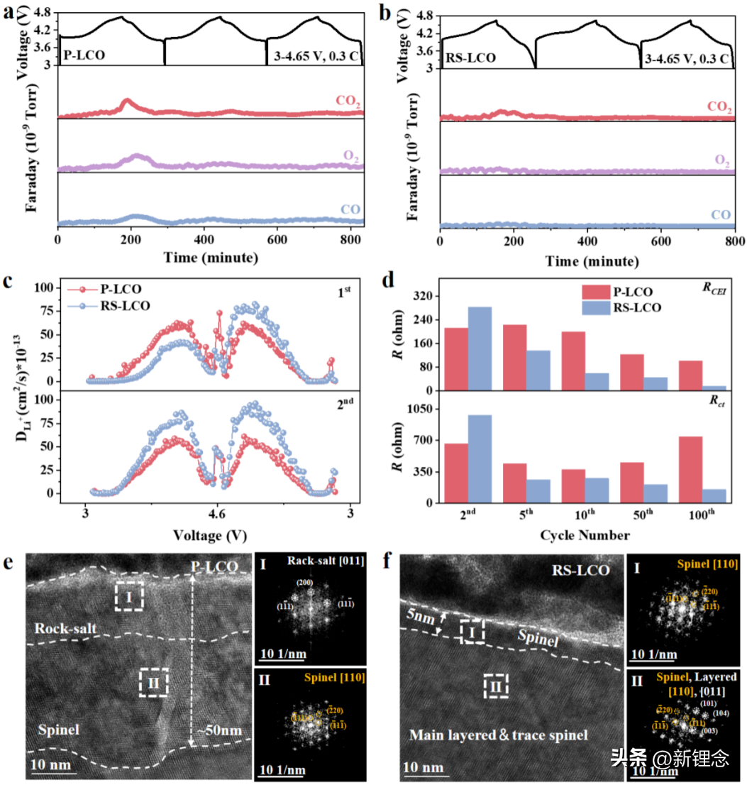 气体释放可以作为评价界面副反应的指标。原位电化学质谱(DEMS)测试用于探测LCO/Li电池在最初三个循环中在3-4.65V和0.3C下的气体释放(图5a,b)。RS-LCO/Li电池的气体释放量明显低于P-LCO/Li电池,说明副反应较少,伴随着CEI的优化,使其能够在循环过程中快速、稳定地嵌入/脱出Li+,计算的Li+扩散系数(DLi+)表明,在第一次充电过程中,RS-LCO的DLi+值明显低于P-LCO,这主要是由于表面盐岩层的缺Li+特性造成的,而在第一次放电过程和第二次循环中,RS-LCO的DLi+值明显变高,说明由于成功的“盐岩到尖晶石”转变而增强了Li+离子在整个表面上的扩散动力学。阻抗测试的结果也很好的说明了这一点,RS-LCO的RCEI值明显低于P-LCO,从第2次到第100次循环,由于盐岩到尖晶石的相转变,RS-LCO的Rct值逐渐减小,促进了高离子导电性尖晶石型LixCo2O4的形成。用透射电子显微镜表征了LCO在3-4.6V和1C下1000次循环后的表面结构,对于P-LCO,我们在表面观察到明显的盐岩相层,厚度≈15-20nm,在亚表面观察到尖晶石相层,厚度≈30-40nm,表明表面结构恶化严重。这种表面结构的劣化主要是由于长时间循环中持续的氧丢失和钴溶解所致,是导致严重的容量衰减的原因。对于RS-LCO,表面只有一层很薄的尖晶石相层,是由表面的原始RS层转变而来的,表面盐岩层不仅减少了副反应,促进了均匀而薄的CEI层的形成,而且通过形成高离子导电性的表面尖晶石(即LixCo2O4)相,提高了Li+离子的传输动力学。这种多重效应的根本原因主要归因于表面RS层捕获活性O的作用,它捕获了活性O并减少了Co的溶解,从而使表面结构稳定,提高了RS-LCO的循环和倍率性能。