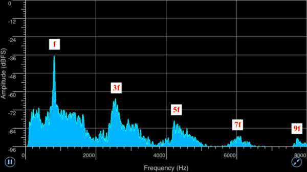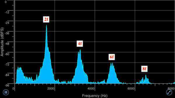 这时我们看到谐振尖峰中只有偶次倍频,没有奇次倍频。当然我们也可以定义F=2f,这样频谱上的这些2f,4f,6f,8f倍频的尖峰,就可以看成:1F,2F,3F,4F,也就是说,是F的整数倍频。
