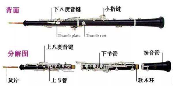 双簧管不用的时候,是拆成四节放在乐器盒里储存携带的。双簧管分解开之后,可以看出从簧片到扬音口,管内的空腔逐渐地变粗,近似一个锥形体。