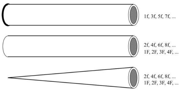 “对于铜管乐器来说,还有一个极为特殊的地方。”爷爷接着解释:“因为我们演奏铜管乐器的时候,都是用嘴堵住吹口,所以铜管乐器都是一端封闭的管道。如果管道是粗细均匀的柱形体,它就只能得到1f、3f、5f等等奇数倍频,这样可以演奏的音符就太少了。因此必须想办法获得整数倍频序列的谐振频率,也就是1F、2F、3F、4F等等。”