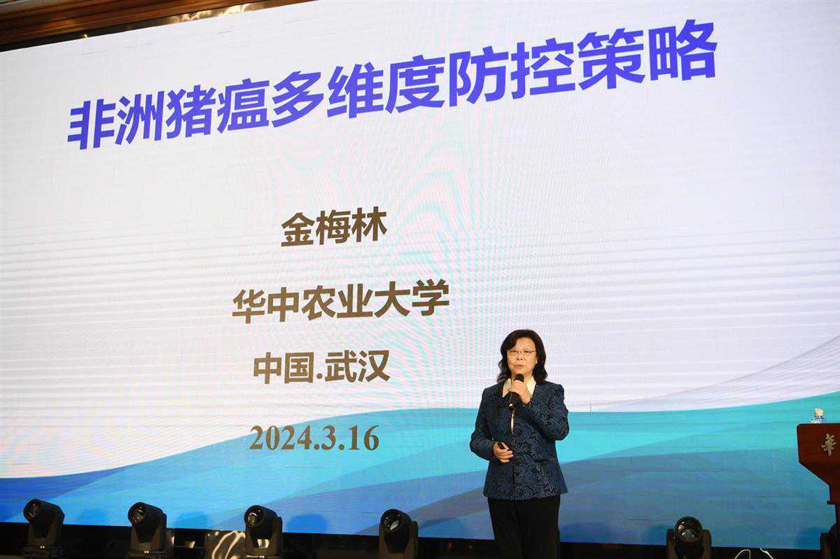 金梅林院士作了《非洲猪瘟的多维度防控策略》报告。她从生物安全科学管理,预警监测关口前移、源头防控、生物活性制剂“未病”预防、疫苗免疫防大于“治”四个维度讲述非洲猪瘟生物防控技术对策。