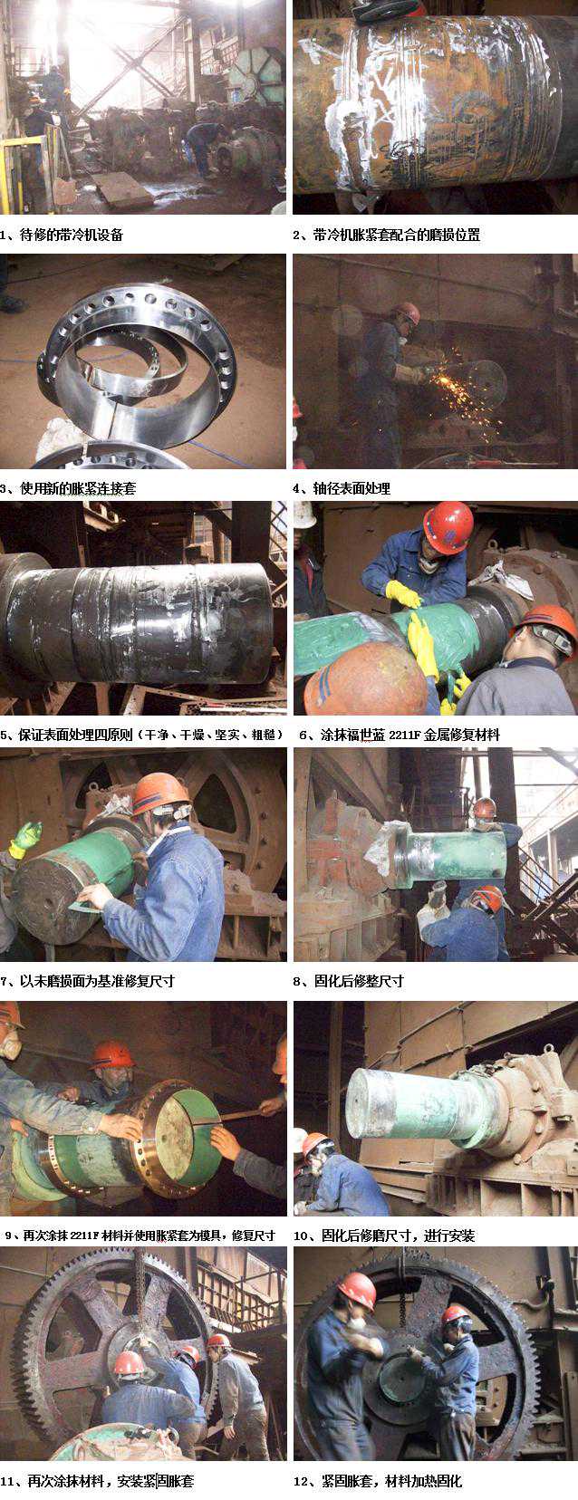 传动部位磨损问题是生产型企业目前存在的普遍的设备问题,并且数量较大,损坏频繁,其中包括各种轴类、辊类、减速机、电机、泵类等轴承位、轴承座、轴承室、键槽及螺纹等等部位,传统的补焊机加工方法易造成材质损伤,导致部件变形或断裂,具有较大的局限性;刷镀和喷涂再机加工的方法往往需要外协,不仅修复周期长、费用高,而且因修补的材料还是金属材料,不能从根本上解决造成磨损的原因(金属抗冲击能力及退让性较差);更有许多部件只能采取报废更换,大大增加了生产成本和库存备件,使企业良好的资源优势遭到闲置和浪费。