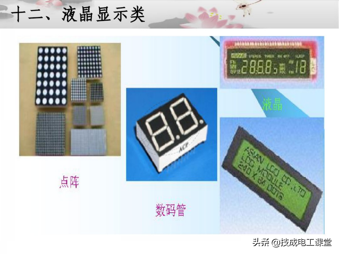 电阻、电容、电感、电位器、电子管、散热器、机电元件、连接器、半导体分立器件、电声器件、激光器件、电子显示器件、光电器件、传感器、电源、开关、微特电机、电子变压器、继电器、印制电路板、集成电路、各类电路、压电、晶体、石英、陶瓷磁性材料、印刷电路用基材基板、电子功能工艺专用材料、电子胶(带)制品、电子化学材料及部品等。