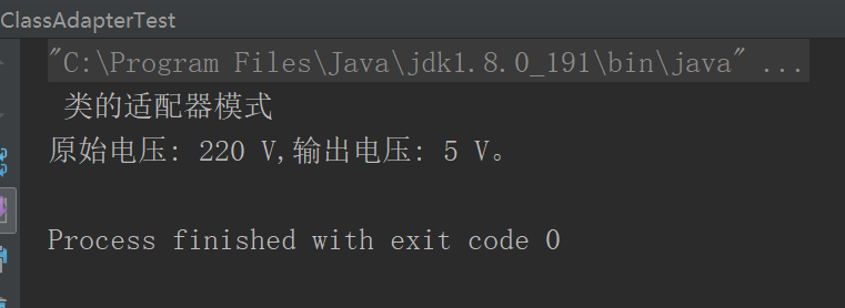 publicclassClassAdapterTest{publicstaticvoidmain(String[]args){Adapteradapter=newAdapter();();}}classAdapte{publicintoutput220(){return220;}}interfaceTarget{intoutput5V();}classAdapterextsAdapteimplementsTarget{@Overridepublicintoutput5V(){("类的适配器模式");inti=output220();//(("原始电压:%dV,输出电压:%dV。",i,5));return5;}}运行结果如图: