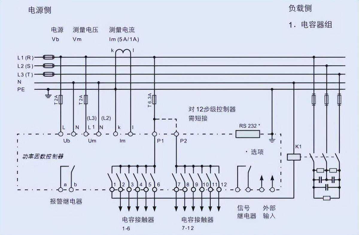 工作方式:电容器总容量分为2~6组,通过无功控制器自动分组投切。