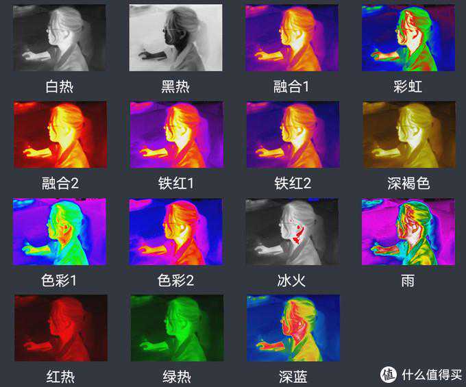 配色方案一共15种,其实热成像测温仪实际获得的是灰度图,各种配色都是经过算法结合灰度图后着色形成的画面。