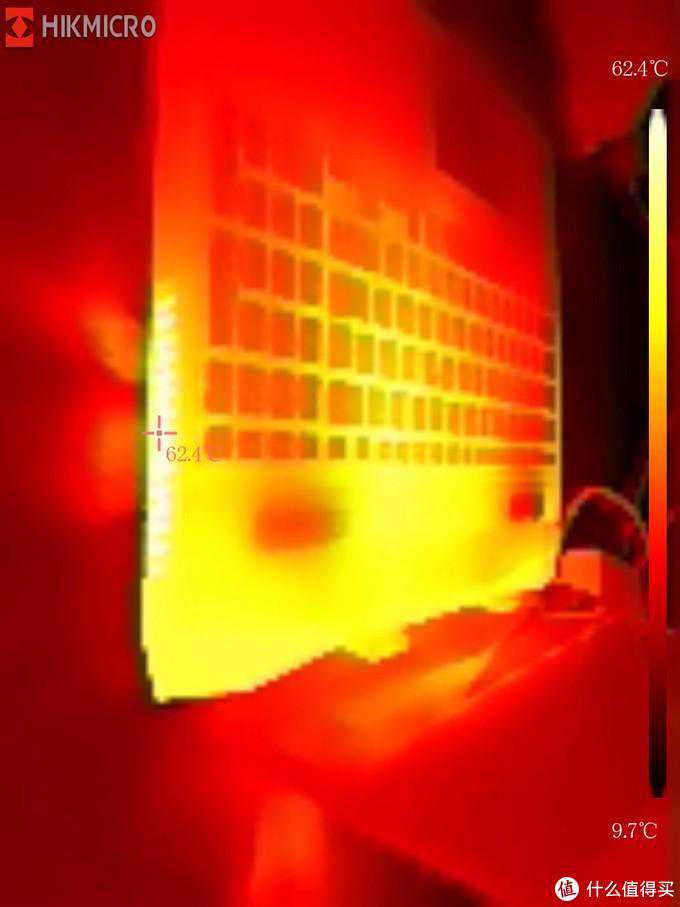 侧面出风口温度62.4度,散热效率较高,温度被快速排出机身。