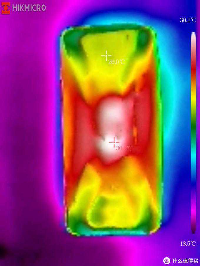 通过这张图可以看出这台手机的温度最高点在机身背部中央,而两侧手握的位置温度并不是很高,所以游戏时握持手感就会好些。如果使用传统测温设备则很难给阅读者如此直接的展示。