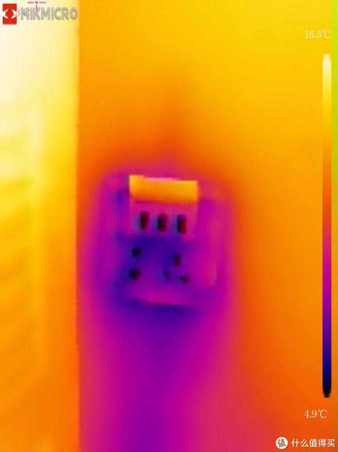 另外我还通过热成像发现家里最冷的地方竟然是电源插座。伸手在附近一试,果然嗖嗖的冒冷风,而且通过热成像可以看到这个走线管像烟筒一样,整个从上到下一条都是冷的。难道是因为电线管路通到外面了?看来需要买一些插座赛把漏风的插座堵上。