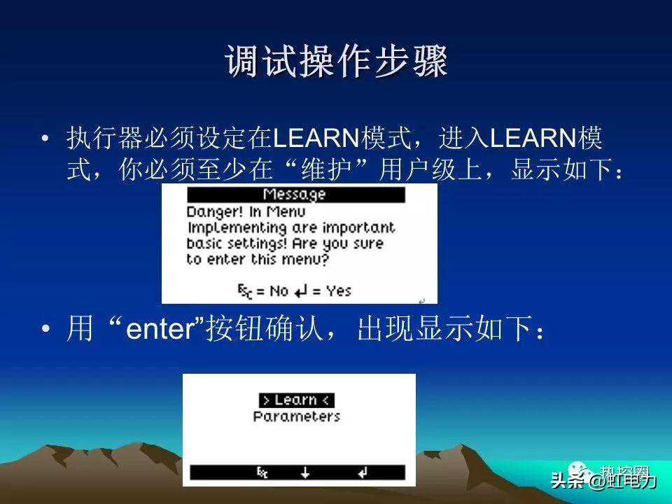 先按下LT按钮并保持,同时把S1拔钮开关移至Learn位置。大约10秒以后,就地指示灯(开、关两只指示灯)同时开始闪亮烁。这表示执行前已经进入调试状态。如果要退出调试提示,只需把S1拔钮开关拔离learn位置。Learn状态就立即解除。