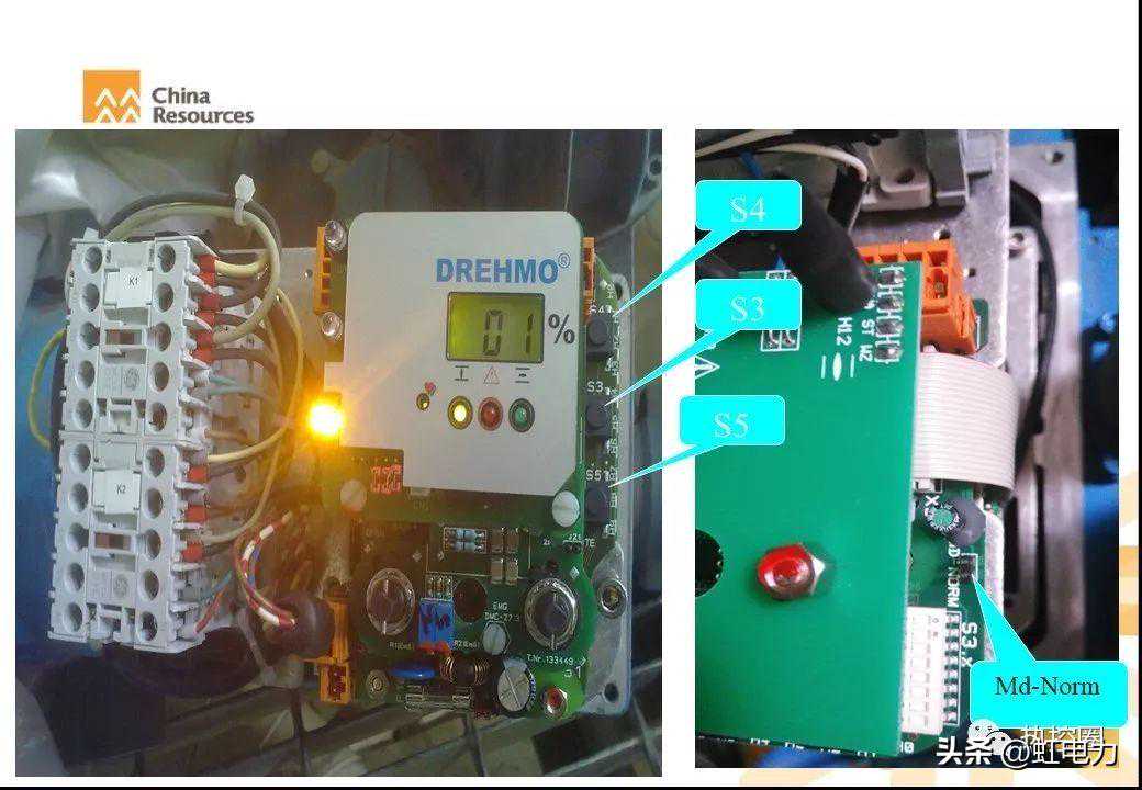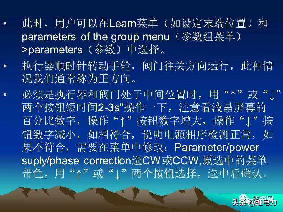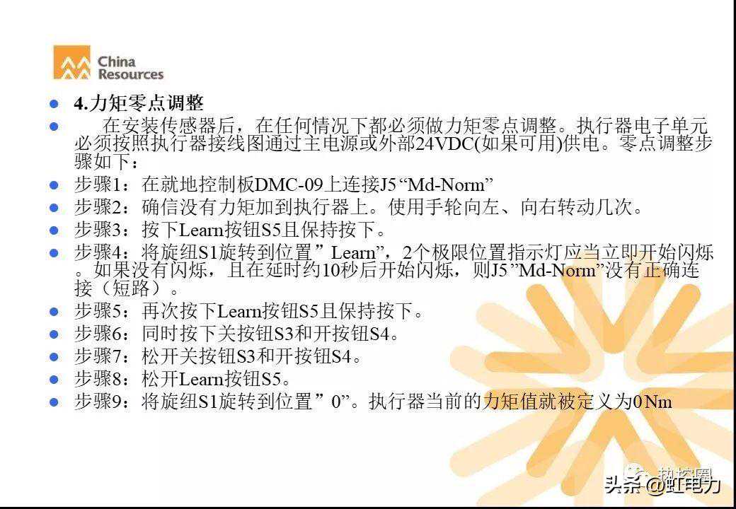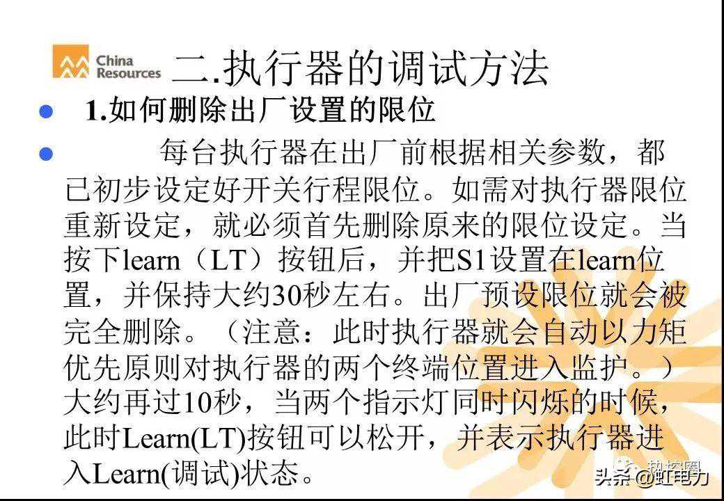 当按下learn(LT)按钮后,并把S1设置在learn位置,并保持大约30秒左右。出厂预设限位就会被完全删除。(注意:此时执行器就会自动以力矩优先原则对执行器的两个终端位置进入监护。)大约再过10秒,当两个指示灯同时闪烁的时候,此时Learn(LT)按钮可以松开,并表示执行器进入Learn(调试)状态。