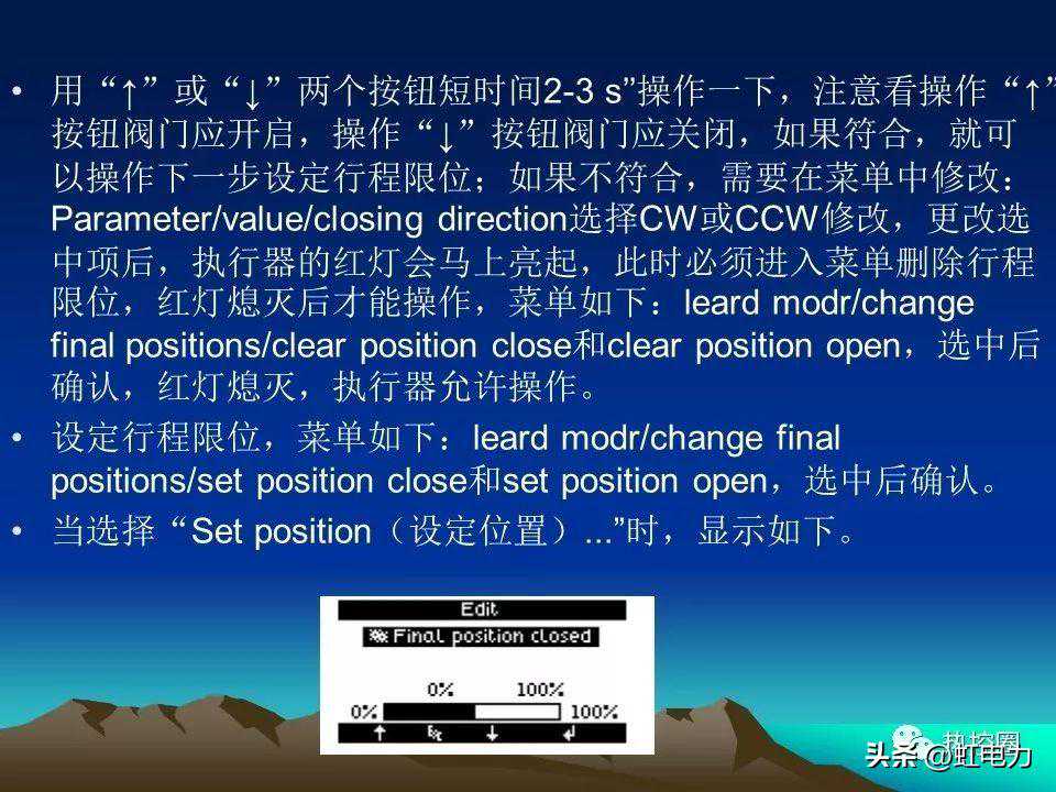 3)当执行器的两个终端位置设定完毕后需更改某一限位设置时,可以按上述调试方法,只需重新设置需要更改的某一限位即可,无需对两个限位同时重新进行设置。