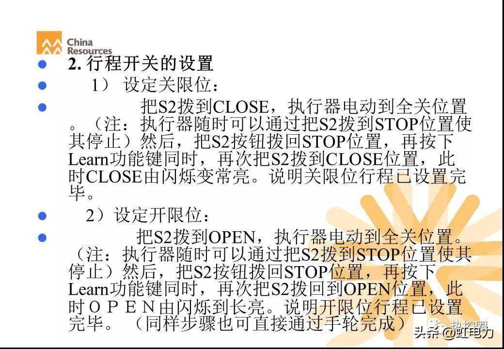 A.设定关限位:把S2拨到CLOSE,执行器电动到全关位置。然后,把S2按钮拨回STOP位置,在按下learn功能键的同时,再次把S2拨到CLOSE位置,此时CLOSE指示灯由闪烁变成常亮。说明关限位行程已设置完毕。(同样步骤也可直接通过手轮完成)