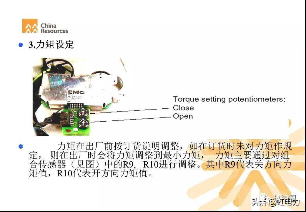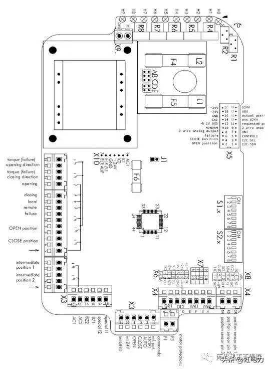 力矩在出厂前按订货说明调整,如在订货时未对力矩作规定,则在出厂时会将力矩调整到最小力矩。力矩主要通过对组合传感器(见图)中的R9,R10进行调整。其中R9代表关方向力矩值,R10代表开方向力矩值。