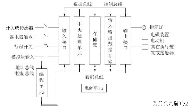 •CPU通过地址总线、数据总线、控制总线与储存单元、输入输出接口、通信接口、扩展接口相连。CPU是PLC的核心,它不断采集输入信号,执行用户程序,刷新系统输出。