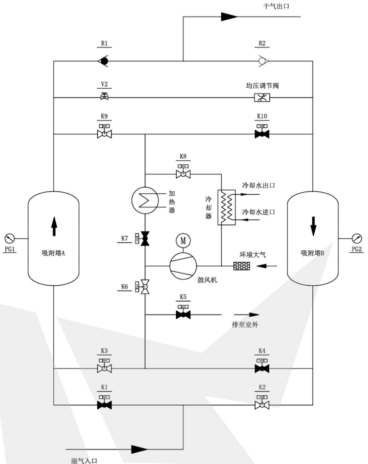 吸附湿气从下方进入,经过打开的K1阀后进入吸附塔A。