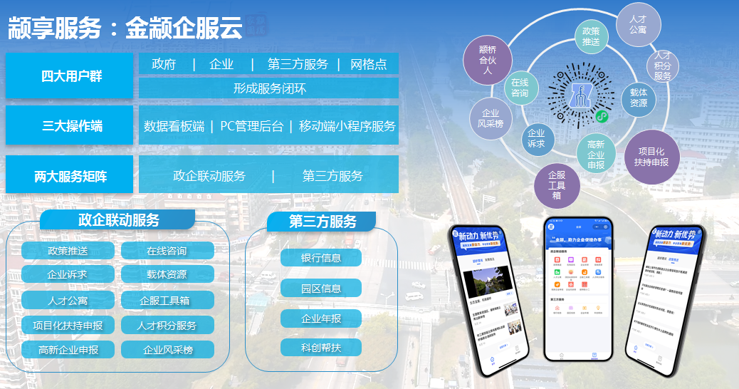 当天,颛桥发布的两项服务新措施为产业大脑平台(“金颛企服云”小程序)、“金颛”企业服务礼包2.0,为辖区内企业打造一站式、全方位、全场景式的服务关怀。其中:“金颛企服云”小程序包括政企联动服务与第三方服务两大服务矩阵,提供政策推送、场地资源、企业诉求、在线咨询、企业工具箱、高新企业申报、人才积分服务、人才公寓等线上服务。升级后的2.0“金颛”服务礼包主要针对企业高端人才,从健康、出行、家政、餐饮和安居等领域着手,配置专属服务管家,提供1V1服务对接,让企业感受到“颛属温度”。